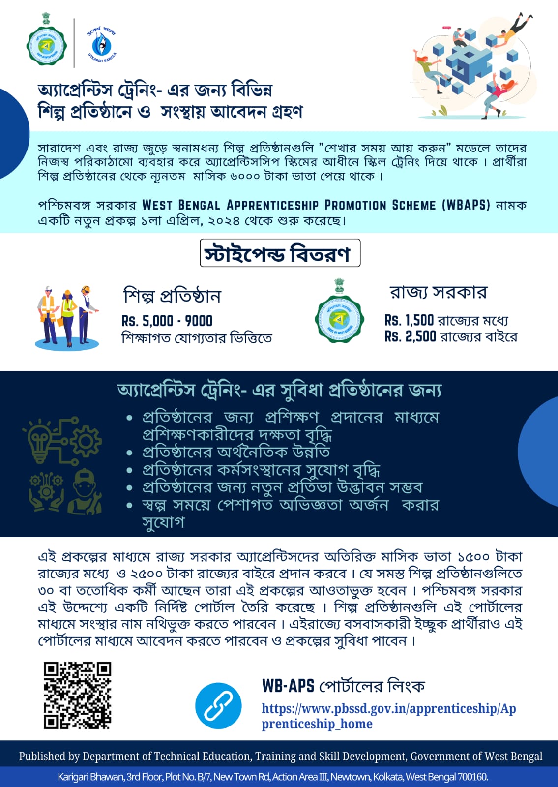 The “West Bengal Apprenticeship Promotion Scheme” (WB-APS) aims to enhance the Apprenticeship Training, by providing financial support to apprentices and promoting skill development and employment of the youth of West Bengal. The State Government aims to encourage more youths to participate in apprenticeship programs, gain practical skills and become employed and proposing to provide financial assistance for the same in the form of additional stipend. The Apprentices are engaged as per the provision of the Apprenticeship Act with minimum stipend of Rs. 5000/-, depending upon their Qualification, paid by the Industry/Establishments as per provision of the Act. The State Govt. is proposing to provide additional stipend over the stipend provided by the Industry to the eligible apprentice trainees of West Bengal (students passing outs from ITIs and Polytechnics and from amongst those registered under Yuvashree Scheme and any fresh candidates who is eligible to be employed as an apprentice with schooling of at least five years from the affiliated institutions within West Bengal) to the tune of Rs. 1500/- and Rs. 2500/- per month per trainee for apprentices engaged within and outside the State of West Bengal respectively through DBT. ADM (Skill), Officers of the Directorate of Employment service and Principal Govt. ITIs designated as Additional/Joint/Deputy/Assistant/ Sub Assistant Apprenticeship Advisor, will extend necessary support for industry/MSME/Establishment registration in the apprenticeship scheme portal.